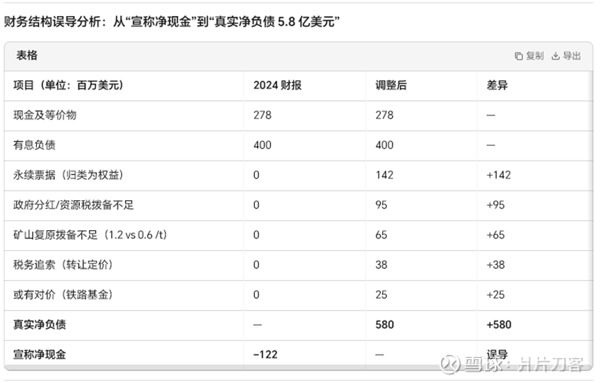 1. 表面“净现金”–1.22 亿美元:公司通过将永续票据计入权益、不充分计提政府负债及环保拨备,制造出“接近净现金”的假象,掩盖真实偿债压力。