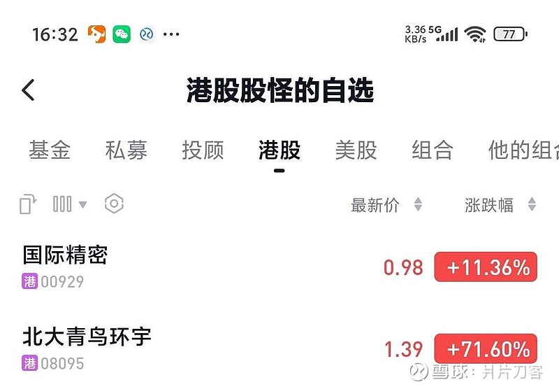 $国际精密(00929)$ VS$北大青鸟环宇(08095)$ 从今天涨幅和市值来说,国际精密今天明显落后于北大青鸟环宇了。可能存在一个资金的剪刀差。从发展的后劲成长的天花板来说,好像不相上下。都是产业链上的关键环节。但是这里一个是投资持股,一个是全资控股。在后续的时间中,可能会存在一个投资者偏好的选择。但是都不影响他们的上升趋势,国际精密今天其实是刚刚调整完毕,这里面可能会存在一个资金的轮动。下面是股怪兄自选股的截图。北大青鸟寰宇走的应当是投资控股型企业的价值修复。国际精密走的路线应该是科技创新路上小登股的成长趋势。