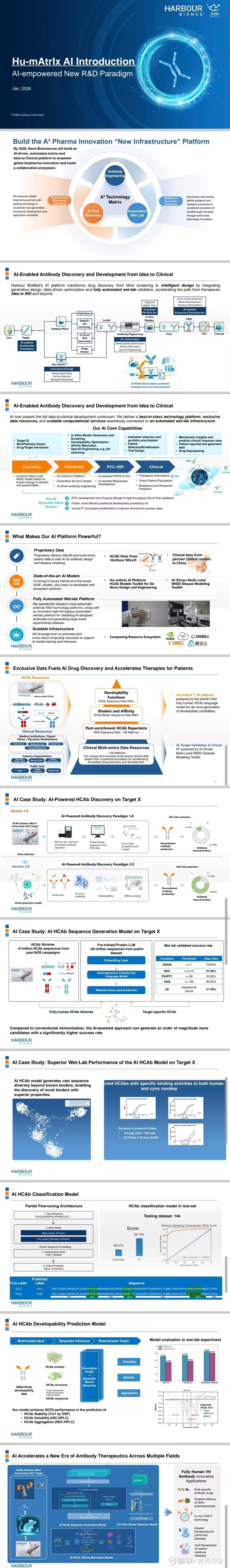和铂医药(02142.HK)正在经历的不仅是技术升级,而是一场由"数据垄断+AI闭环"驱动的商业模式质变。其全球稀缺的全人源HCAb转基因小鼠平台(Harbour Mice®)与自研Hu-mAtrIx™ AI平台的深度融合,正在将沉睡的千万条序列数据转化为可规模化复制的智能研发能力。这解释了为何公司敢于从与外部ai的早期合作,果断转向自建大模型——因为真正的壁垒不在算法,而在别人无法复制的数据生成能力与数据飞轮。“当一家biotech把千万条私有序列变成每轮迭代成功率提升10×、成本下降80%的AI飞轮,它就不再是管线公司,而是生物领域的‘数据即服务’平台,估值体系应从NPV切换到Platform Premium。”