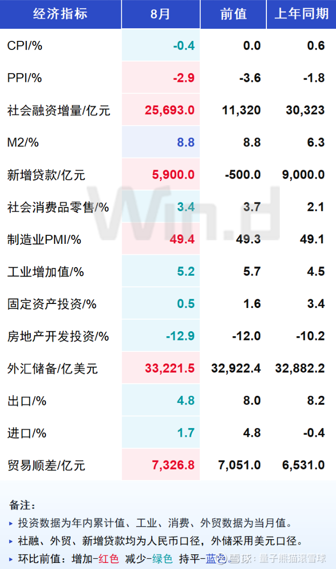 其他几个重要数据,8月社零总额当月同比3.4%,低于前值3.7%,固投累计同比0.5%,低于前值1.6%,规模以上工业增加值同比5.2%,低于前值5.7%,8月成绩单详见下表,难怪今天上午开盘有周末利好和牛市加持都能跳水,不予置评了。