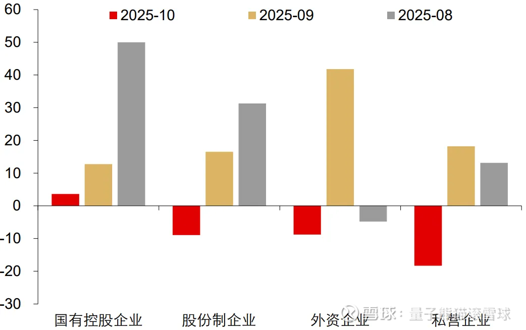 按企业类型看,10月国有控股企业利润增速从9月的12.8%下降至3.6%,私营和外资企业利润同比增速则是从9月的18.2%和41.8%大幅跳水至-18.3%和-8.8%。