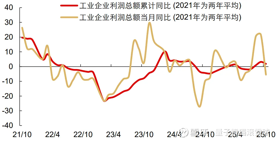 统计局公布1-10月份全国规模以上工业企业实现利润总额59502.9亿元,同比增长1.9%,但如果单独看10月份利润总额同比增速是-5.5%,环比下滑了20.9个百分点,这个水跳的比大A可猛太多了。