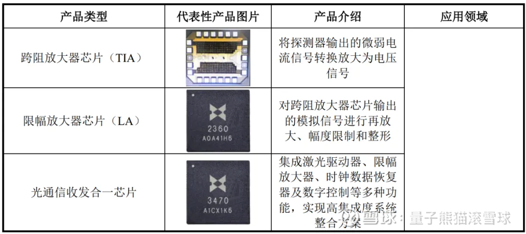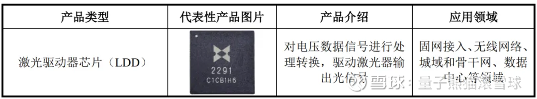 公司主要产品包括激光驱动器芯片(LDD)、跨阻放大器芯片(TIA)、限幅放大器芯片(LA)、光通信收发合一芯片等。这些产品协同工作,为光通信 实现高效、可靠的光电/电光信号转换、放大和处理提供了完整的解决方案。