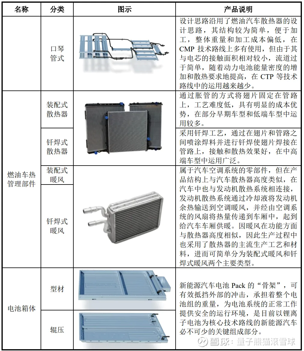 公司主要产品包括电池液冷板、电池集成箱体、燃油汽车发动机散热器、加热器暖风等,其中电池液冷板、燃油汽车发动机散热器、加热器暖风产品已形成批量生产销售,电池集成箱体已完成产品验证,正处于市场推广阶段。