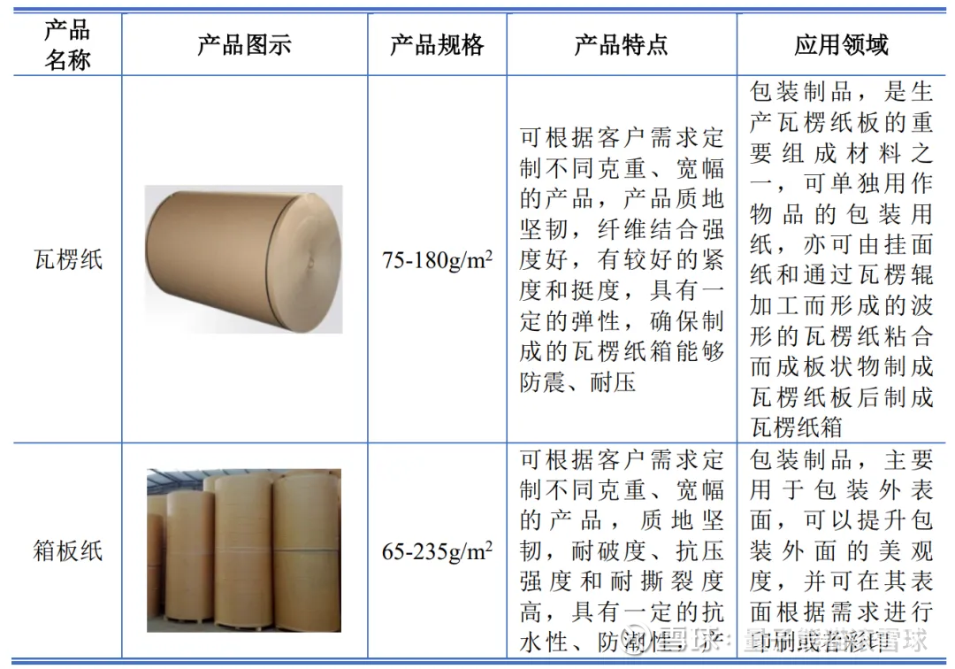 公司产品主要为瓦楞纸、箱板纸,产品规格齐全,具有良好的抗压度、耐破度和耐折度,被广泛应用于包装物制造、工业品及消费品包装领域。