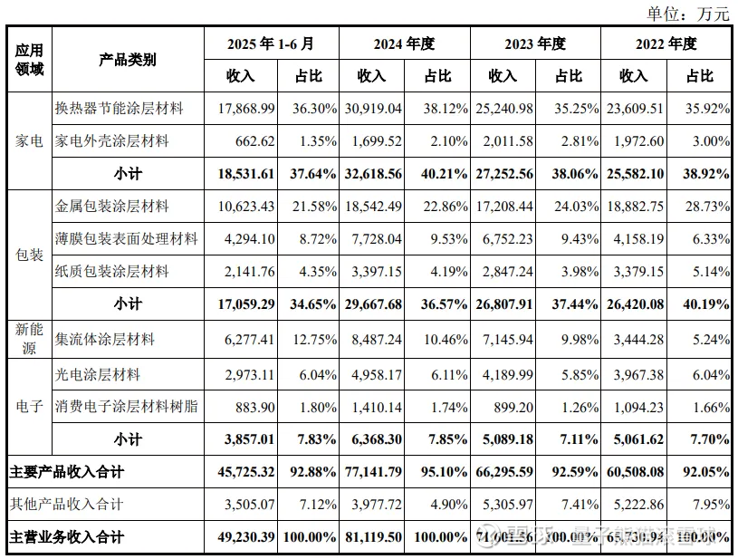 参考招股说明书解释,主要原因是公司家电、包装业务稳健经营,新能源、电子及航空航天涂层材料等业务快速增长带动。
