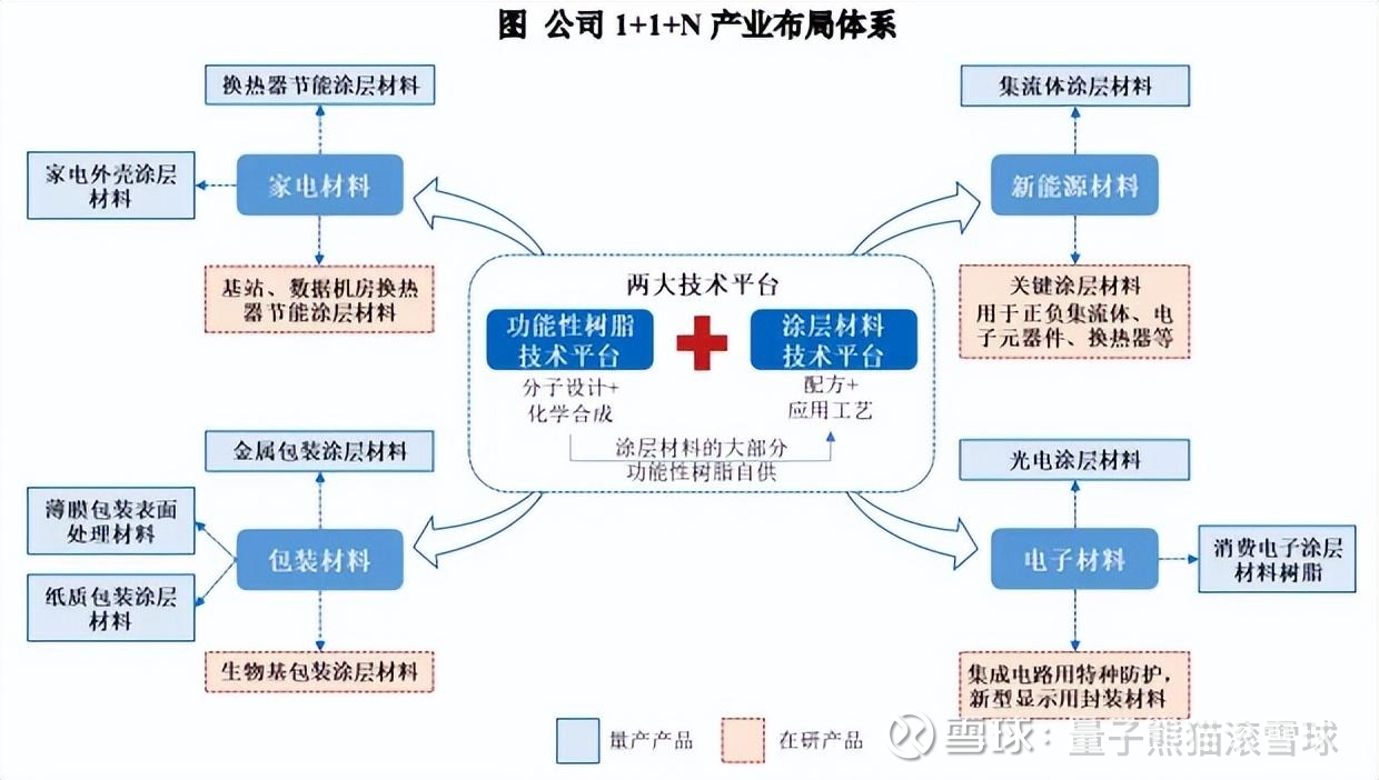 公司依托功能性树脂和涂层材料双技术平台的整合协作,紧密结合国民经济的发展脉络及关键材料需求图谱,成功开发具备光学调控、导电导热、力学增强、防腐耐候等多元特性的涂层材料体系,已形成面向家电、包装、新能源、电子四大下游应用场景的“1+1+N”产业布局体系,致力于社会和产业链的可持续发展,不断培育新质生产力。