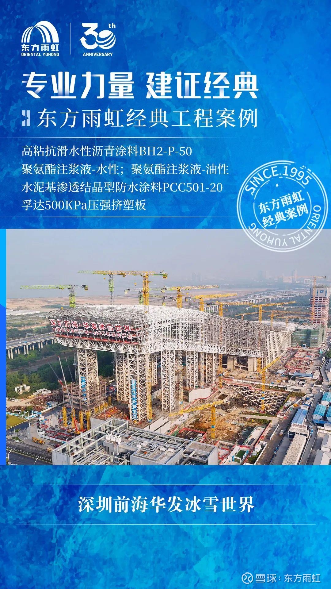 在这座融合冰雪产业链上下游,集专业性、娱乐性与冰雪产业推广于一体的产城融合超级生态中,必然少不了东方雨虹的身影。在施工建设过程中,东方雨虹为项目提供高粘抗滑水性沥青涂料BH2-P-50、聚氨酯注浆液-水性、聚氨酯注浆液-油性、水泥基渗透结晶型防水涂料PCC501-20、孚达500KPa压强挤塑板等材料及配套系统服务,为粤港澳大湾区“冰雪经济”注入专业力量。
