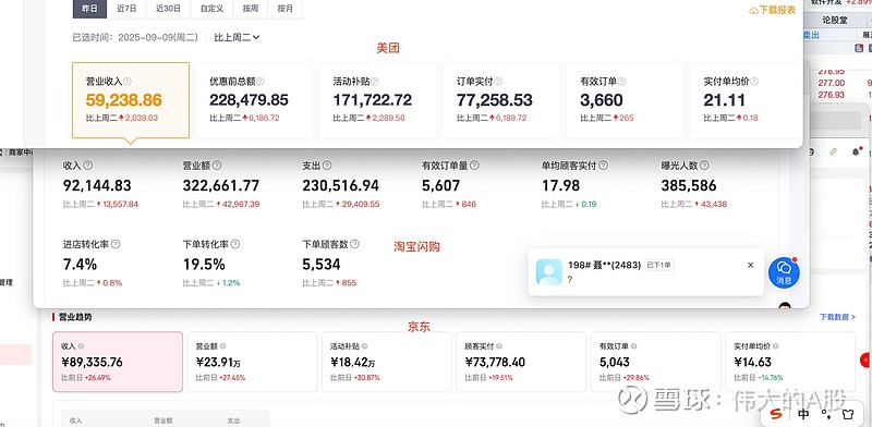 这是餐饮小品牌的整体数据,单量占比美团低10%,京东和饿了么单量差不多。但大家可以通过顾客实付和商家实收算出大致平台的UE,美团每单净抽4.9,扣除配送成本UE(0.5,1.5),淘宝闪购每单净抽1.5(),UE(-2.5,-4),京东每单净抽-3,UE(-7,-10)。零售品牌的数据截图不方便,我大致口述一下,份额大概美团6淘宝4,而且是在淘宝16-8的大活动下,客单价美团平均高5块以上,淘宝的羊毛单和纯快消品订单比例非常高(零售的百货毛利会比快消高出非常多,在配送费作为大头支出的背景下,百货的销量占比和整体客单价是衡量门店毛利最重要的指标)