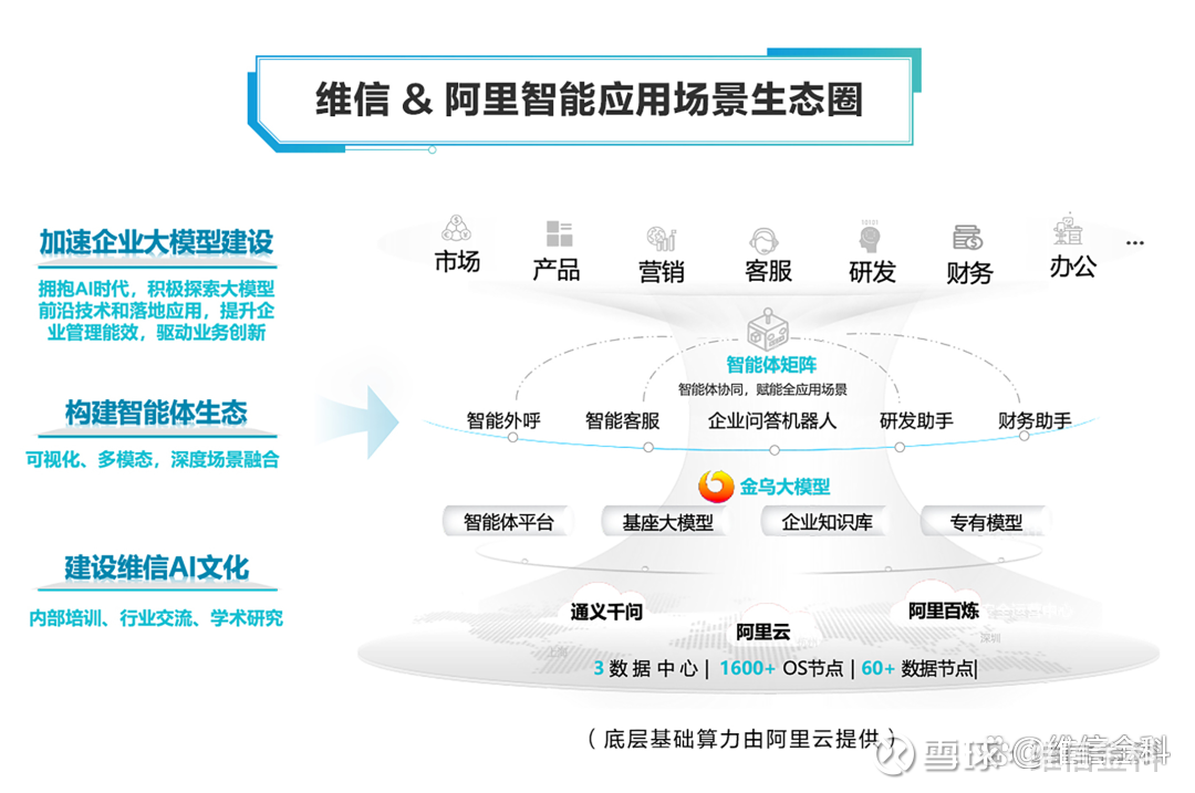 维信金科一直将科技创新视为企业发展的核心驱动力。早在2023年,维信金科便率先启动垂类大模型研发,如今已构建起以头部大模型为引擎、自主创新为核心的技术体系。依托与阿里云的紧密合作,维信金科以阿里云底层算力为支撑,深度整合通义千问、阿里百炼等能力,打造智能应用场景生态圈,覆盖市场、产品、财务、办公、营销、客服、研发等多个维度,为企业数字化升级提供安全、高效的解决方案。