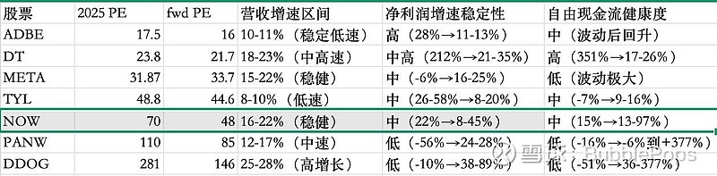$Palo Alto网络(PANW)$ $Datadog(DDOG)$ $ServiceNow(NOW)$ 周末把SaaS赛道全梳理了一遍,筛选出商业模式清晰、且具备十年长期竞争优势的企业,提取财务数据让AI列出来和META做了横向对比,看看有没有值得布局的标的。感觉目前估值下杀得还不够深,市场怎么突然不恐慌了?说好的AI颠覆性冲击呢?