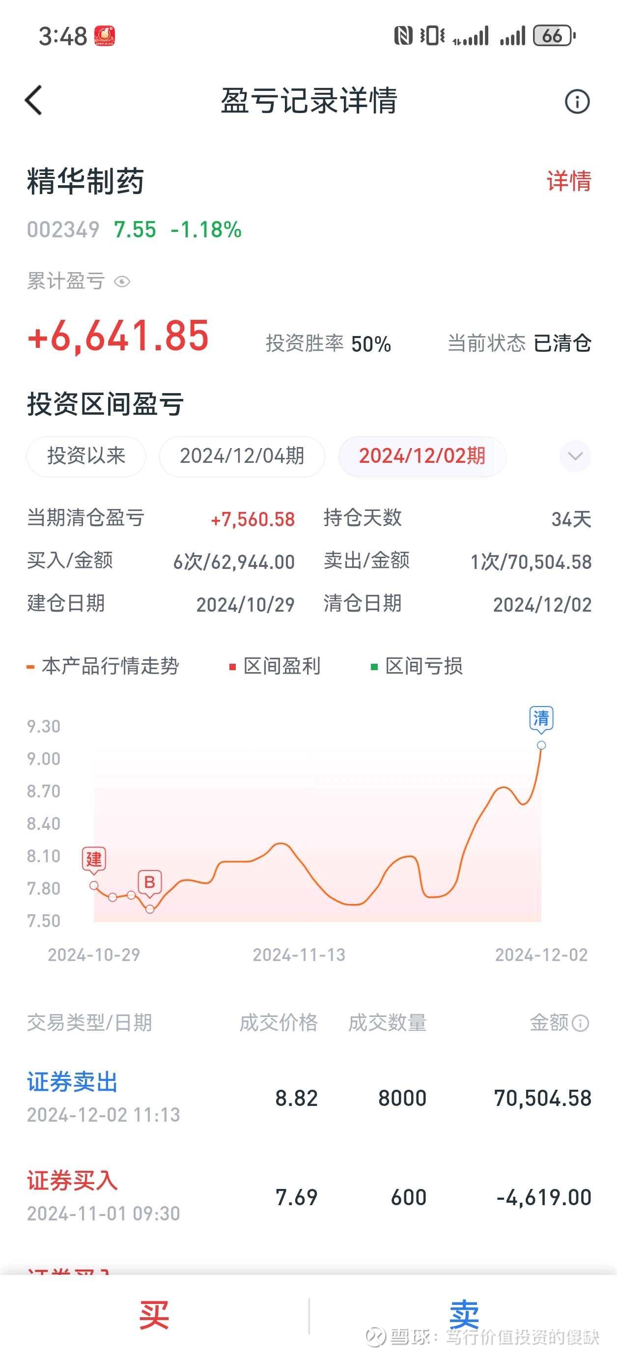 在精华制药(002349)这笔交易中,我没有追逐热点,也没有频繁操作。从2024年10月29日建仓,到12月2日清仓,持仓34天,累计盈利 +6,641.85元,当期清仓盈亏高达 +7,560.58元。