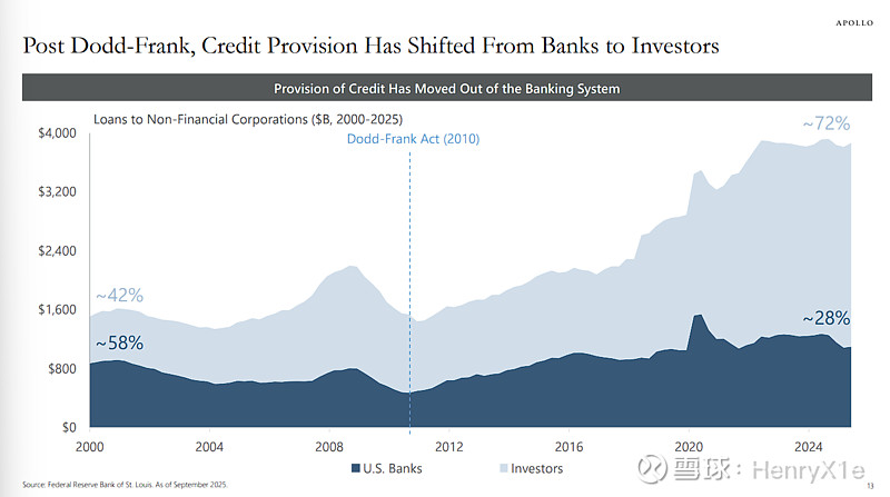 这张图表揭示了美国非金融企业信贷市场在过去15年发生的结构性权力交接,核心分水岭是2010年的《多德-弗兰克法案》。在此之前,银行是信贷供给的绝对主力,持有约58%的市场份额;但截至2025年9月,这一格局已彻底反转,非银行机构(即图中的“投资者”,包含私募信贷基金、保险和养老金)占据了约72%的份额,而银行仅剩约28%。这表明企业融资渠道已从传统的银行体系大规模迁移至私募市场。