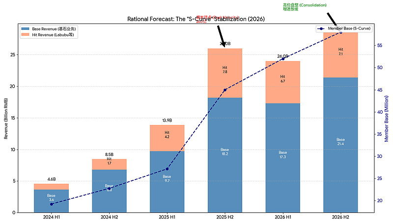2. 柱子的蓝色部分是根据会员数*复购率进行的现象外推, 理论根据是这块base的销售收入, 和会员数*复购率呈正比关系(平均会员购买金额和非会员部分, 作为hit的存在)。 这块在2025年通过labubu的拉新, 会员数根据收入的增长和labubu的30%占比情况, 进行了爆发式的增长, 具体体现为上面的点状蓝线。 但是这个爆发式的增长, 不认为是会持续。 新会员的复购率不假设会保持50%, 从而导致2026年的BASE收入低于2025年H2. 这个应该合理, 需要一个会员