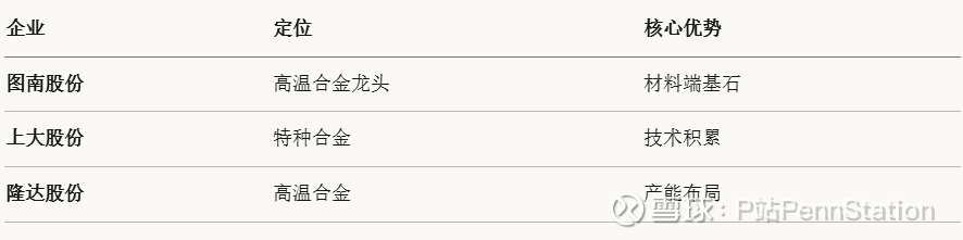 代表企业: 应流股份、万泽股份(叶片);航宇科技、三角防务、崇德科技、联德股份、豪迈科技(其他热端部件);图南股份、上大股份、隆达股份(高温合金)