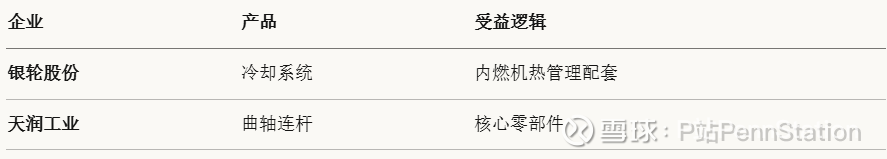 代表企业: 潍柴动力、中国动力(内燃机);银轮股份(冷却)、天润工业(曲轴连杆);潍柴重机、科泰电源(柴油机组)