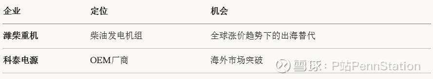 产业逻辑: 燃气轮机供不应求,部分需求外溢至燃气内燃机。中速机发电效率高、交付更快,在50-400MW功率段优势明显。全球龙头订单饱满,国内企业有出海替代机会。