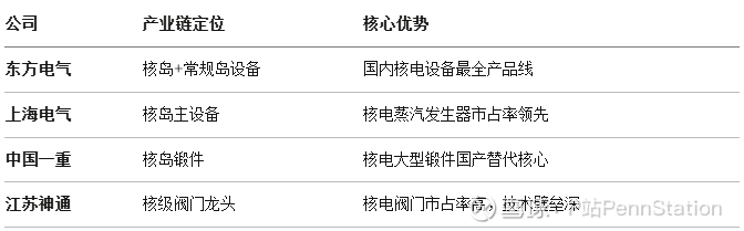 公司 产业链定位 核心优势 中国核建 核电工程建设 国内核电工程建设绝对龙头 台海核电 核电管道 核级管道设备,出海跟随
