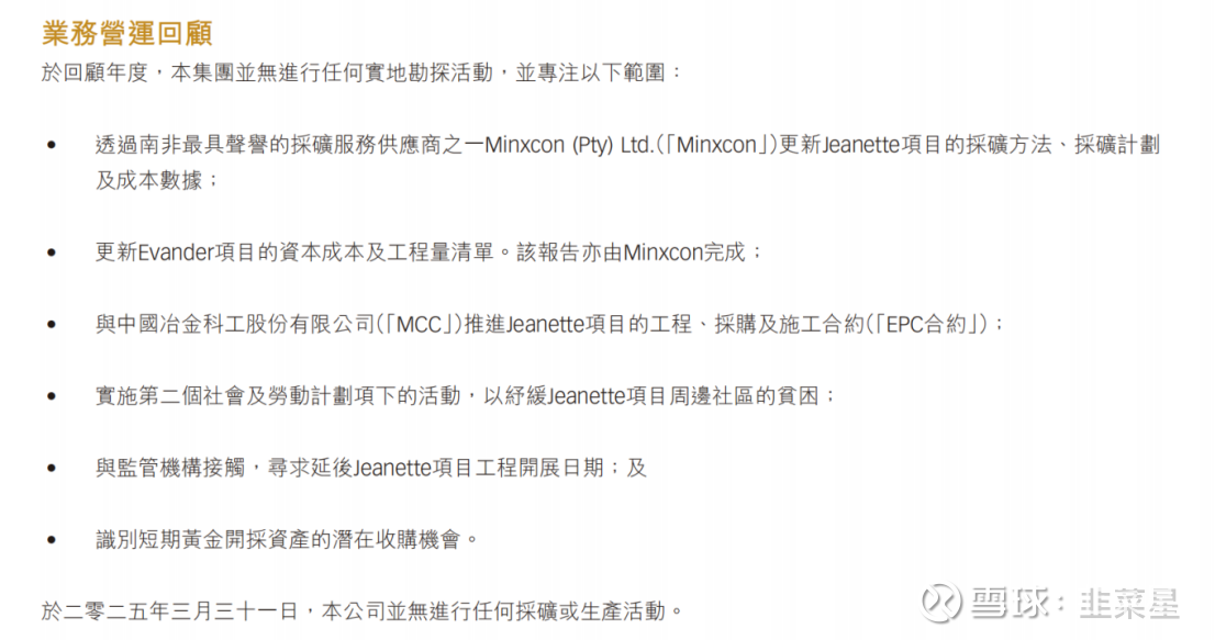 2024年就做了上面这些事,找Minxcon更新2个金矿的采矿方法,采矿计划,成本数据;与MCC推进J矿的EPC合约进度;砸钱舒缓J矿附近的社区服务,为后续项目的顺利开展做准备;与监管机构接触,寻求延后J矿工程开展日期和寻找短期就可以开采的金矿收购机会。