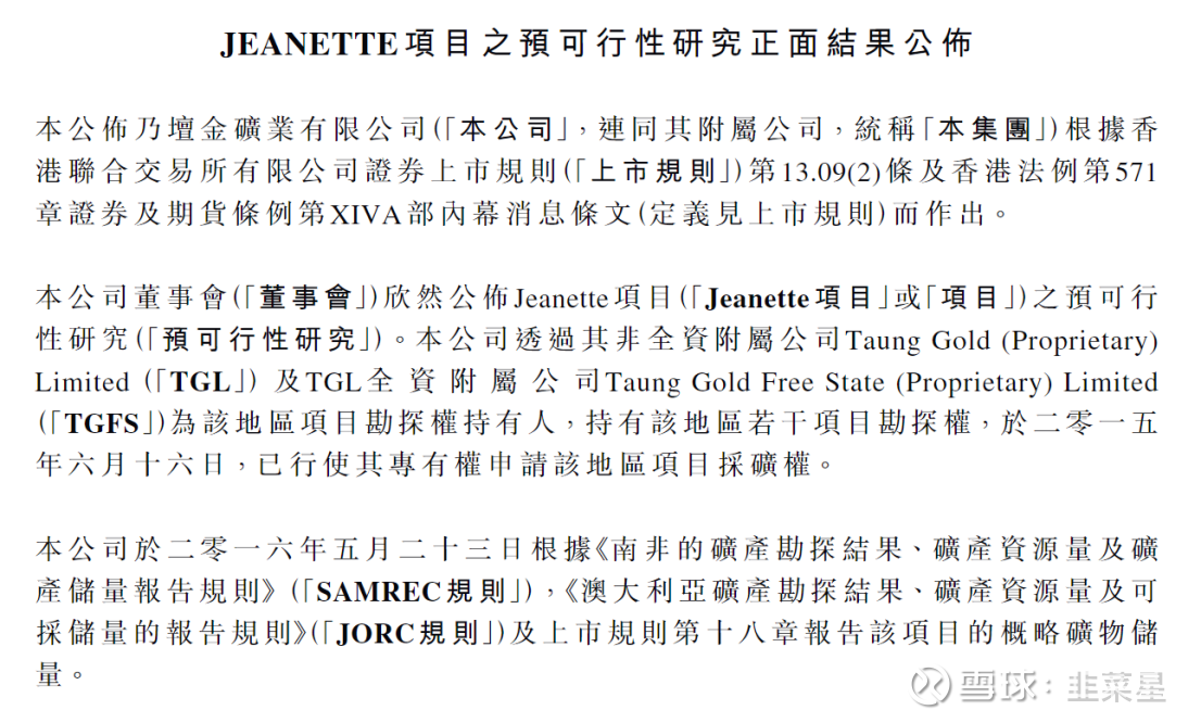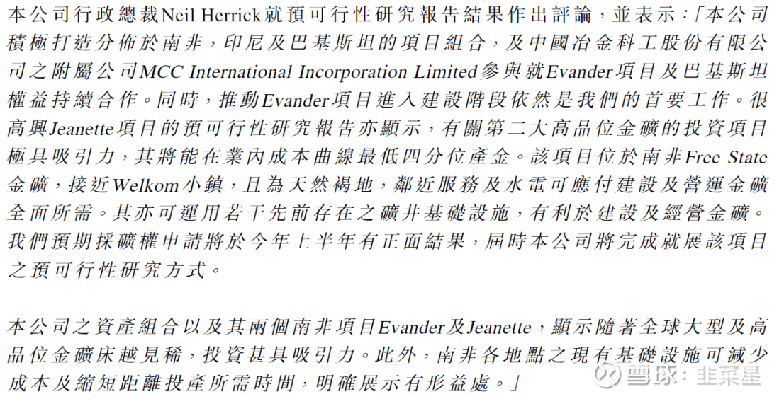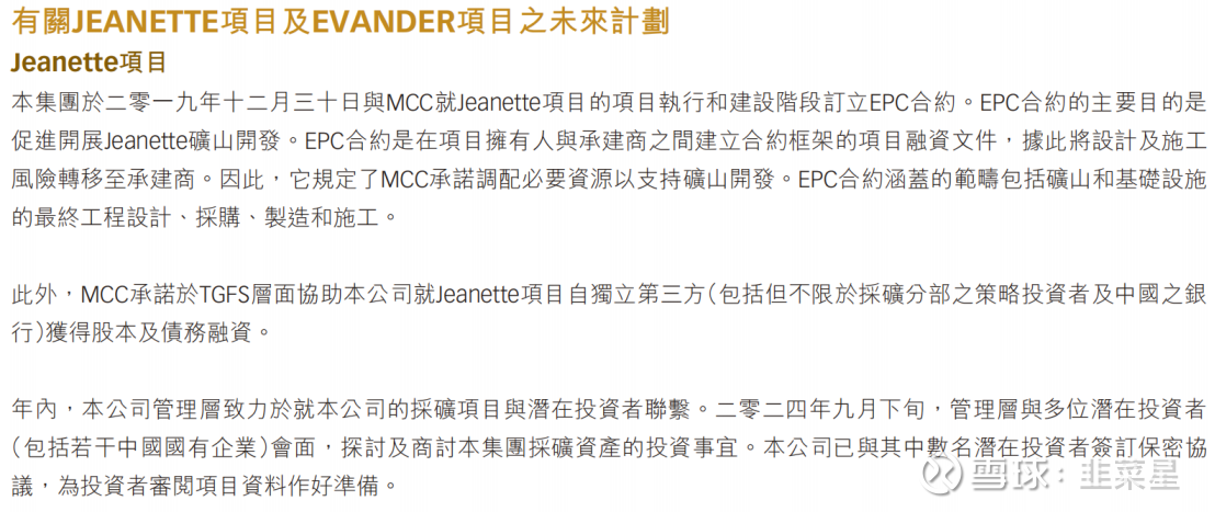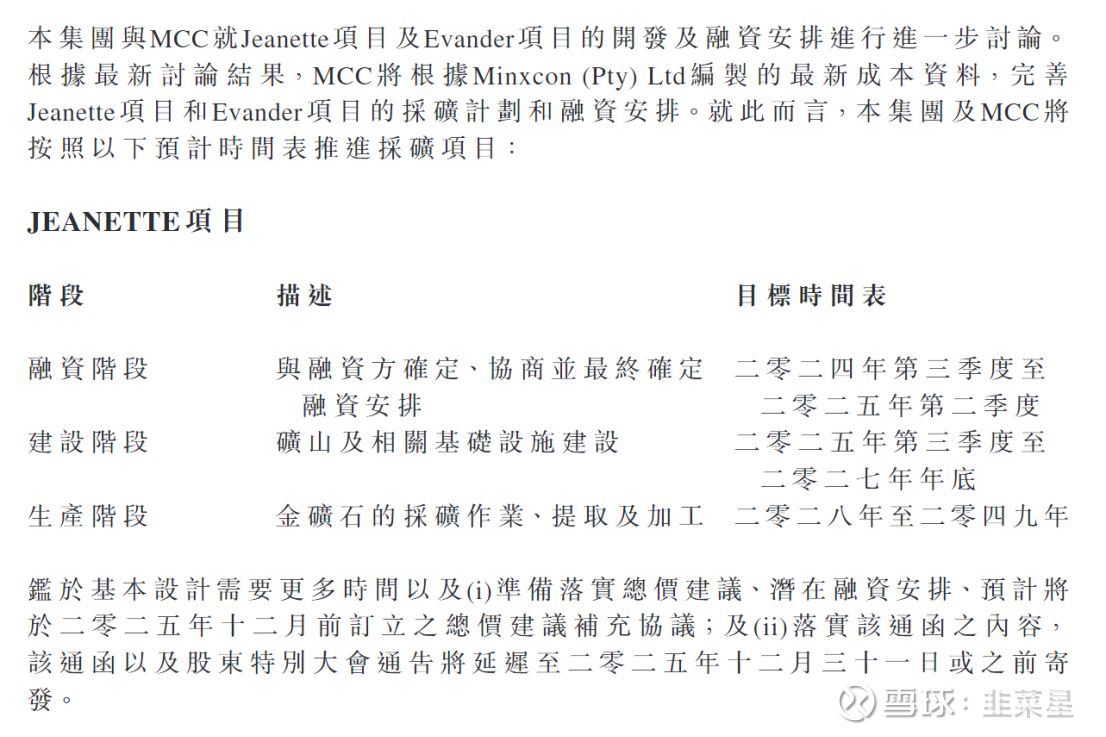 根据公司的年报显示,2019年7月已完成了可行性研究,可行性研究由MCC(中国冶金科工股份有限公司)的附属公司MCCI完成。2023年10月,公司聘请了Minxcon对可行性研究升级,证实了项目的稳健可行性。随后,公司的管理层拜访了中国冶金科工股份有限公司(MCC),讨论了Jeanette项目的基本设计,也重新开展了融资人的磋商。