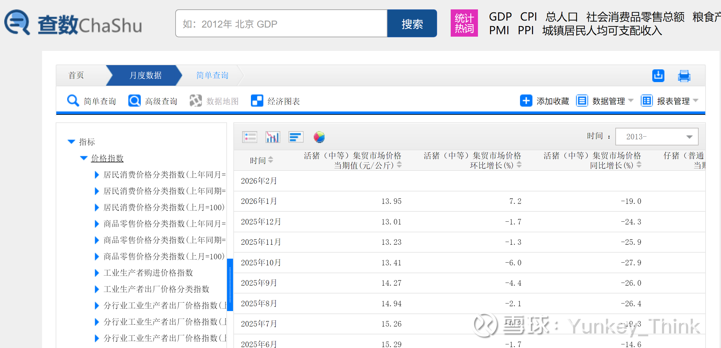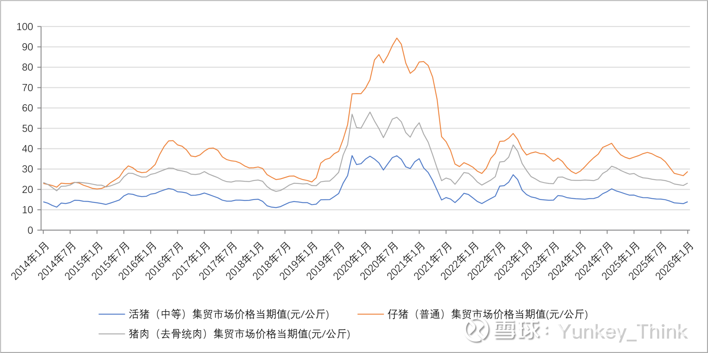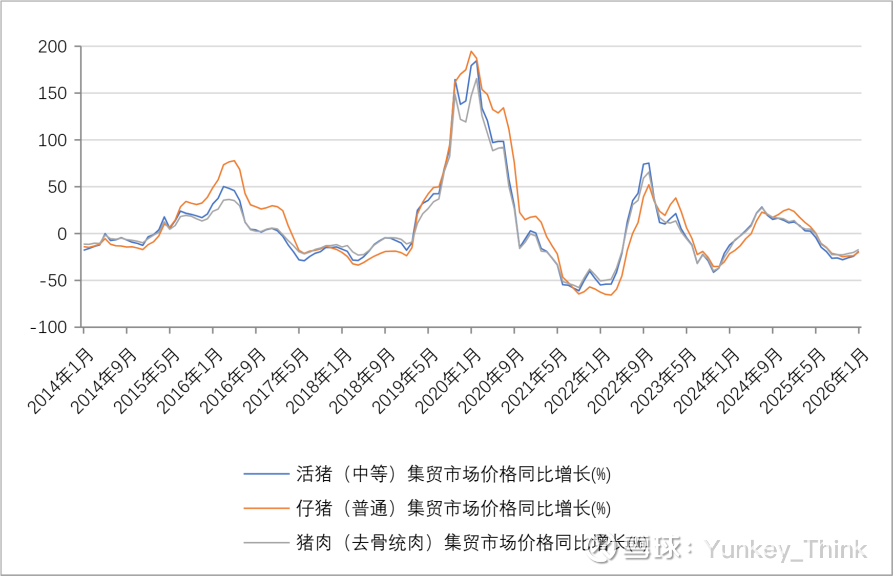 我又从国家统计局查了下,活猪(中等)集贸市场价格同比增长(%)、仔猪(普通)集贸市场价格同比增长(%)、猪肉(去骨统肉)集贸市场价格同比增长(%)、活猪(中等)集贸市场价格当期值(元/公斤) 、仔猪(普通)集贸市场价格当期值(元/公斤)、 猪肉(去骨统肉)集贸市场价格当期值(元/公斤) 的月度数值(2014年1月至2026年1月),并汇总成曲线如下。