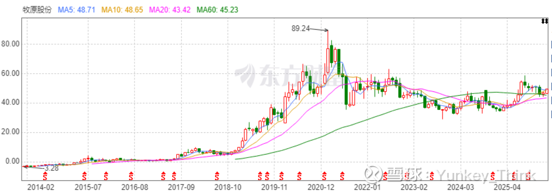再看龙头 $牧原股份(02714)$ $牧原股份(SZ002714)$ 股价(我懒得把一个个数据画在一张曲线图里了,用AI数据不准,老毛病,不知为啥)。和肉价及同比增长率整体有一定关联度,个人感觉尤其是仔猪的价格可以作为一个前行指标。