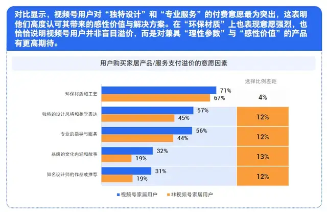 与此同时,视频号用户展现出典型的“品质升级型”消费特征,他们对“独特设计”和“专业服务”的付费意愿最为突出,认可其带来的感性价值与解决方案。此外,在消费理念上,视频号用户更重视环保材质和工艺(71%)、设计美学(57%)、专业服务(56%)与品牌文化(32%),对“软价值”有更强支付意愿。