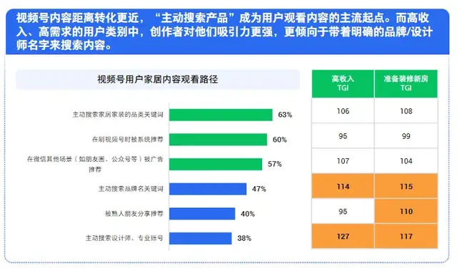 这背后得益于视频号构建的是以“好内容”为核心的平台生态。也就是说,视频号用户不是在“刷”视频,而是在“看”内容,尤其高价值用户倾向于追随“专业人士”与“创始人”等专业账号,以获取决策支持。值得注意的是,63%的用户会主动搜索家居家装的品类关键词,47%的用户会主动搜索品牌名。