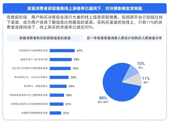而且,在信息获取上主要集中在几大线上平台,其中67%的消费者会通过短视频平台,已超越线下家居垂直渠道与品牌专卖店已成为用户获取信息占比最高的渠道,对决策影响愈发明显。