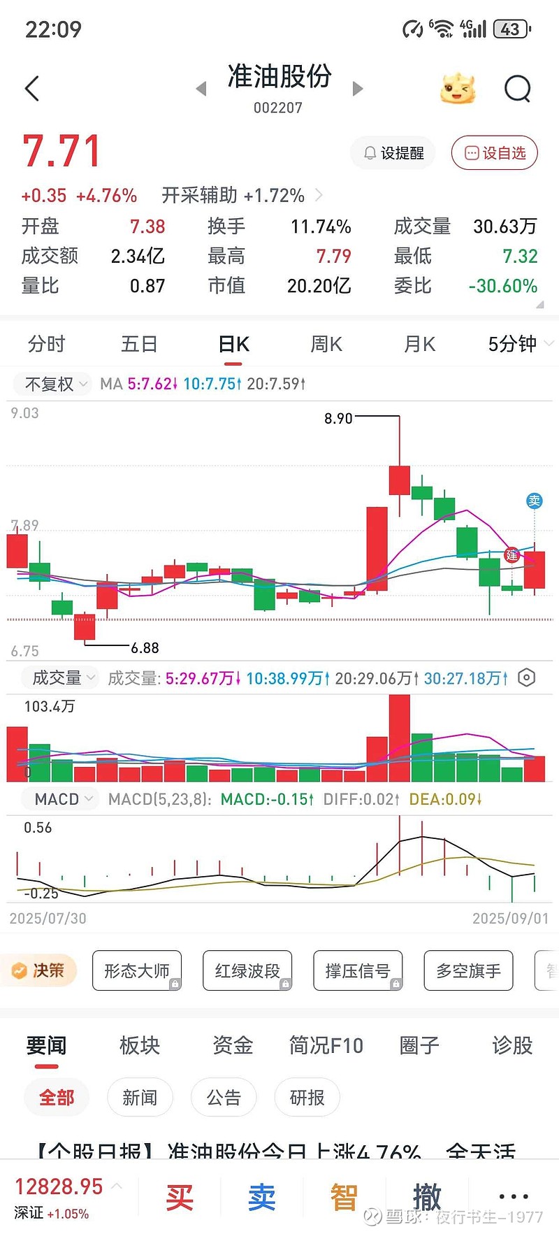 $准油股份(SZ002207)$ 今天给出了一根漂亮的放量中阳线,这正是我所期待的,基本上可以判断出前期的下跌趋势,在今天出现逆转,这是一个好的开端,但不一定明天就会大涨,因此我今天在7.68出了部分仓位,为迎接明天的振荡,做T准备仓位。如果想要大涨,只能持续放量阳线上攻,而且要突破今天的量能最佳。今天唯一美中不足的是,换手率11.74%不及28日的12.35%,希望明天能够超越。