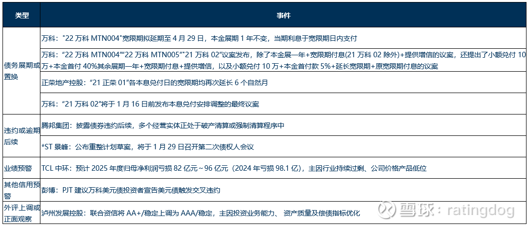 违约或逾期后续方面,腾邦集团多个经营实体正处于破产清算或强制清算程序中;*ST景峰公布重整计划草案,将于1月29日召开第二次债权人会议。