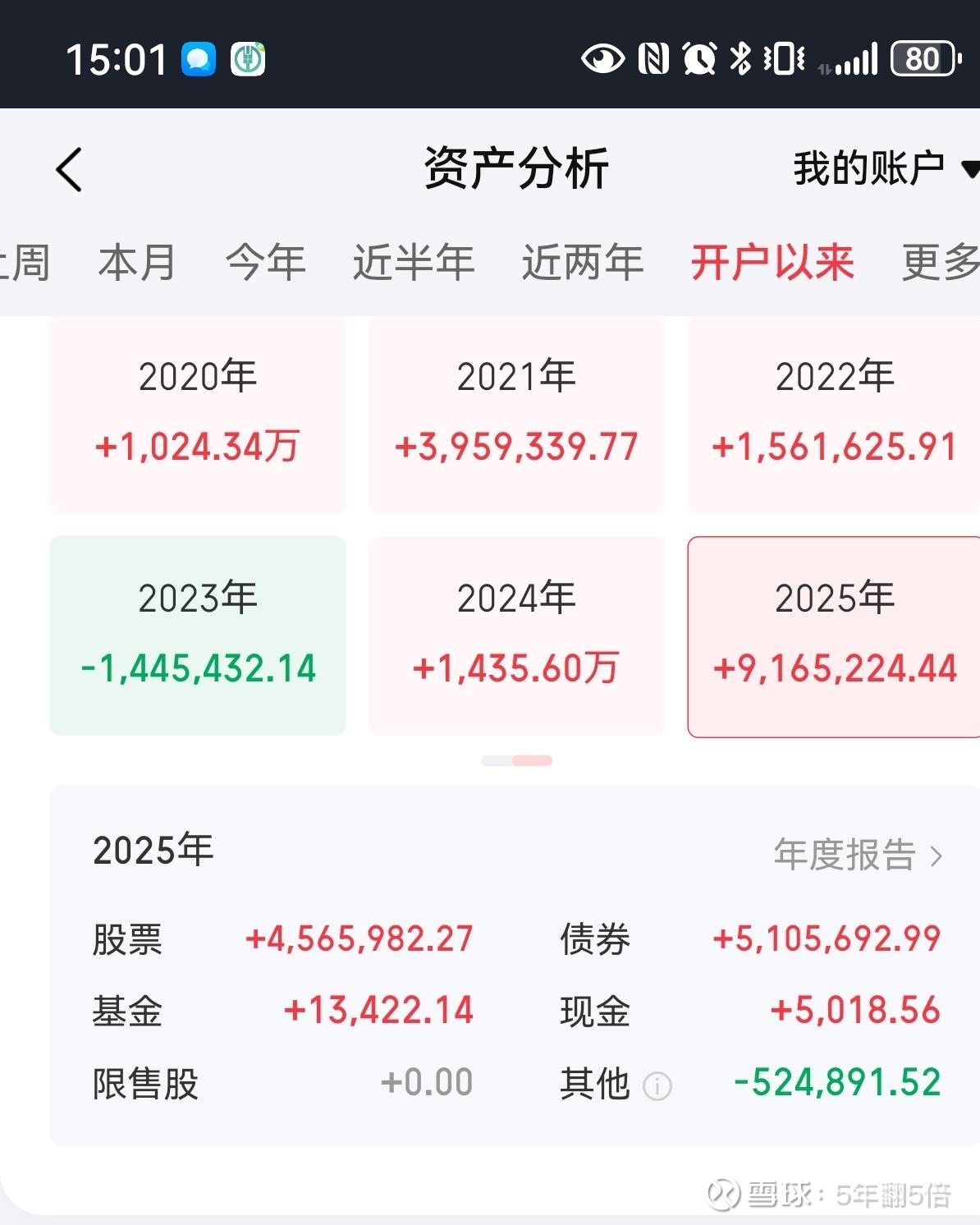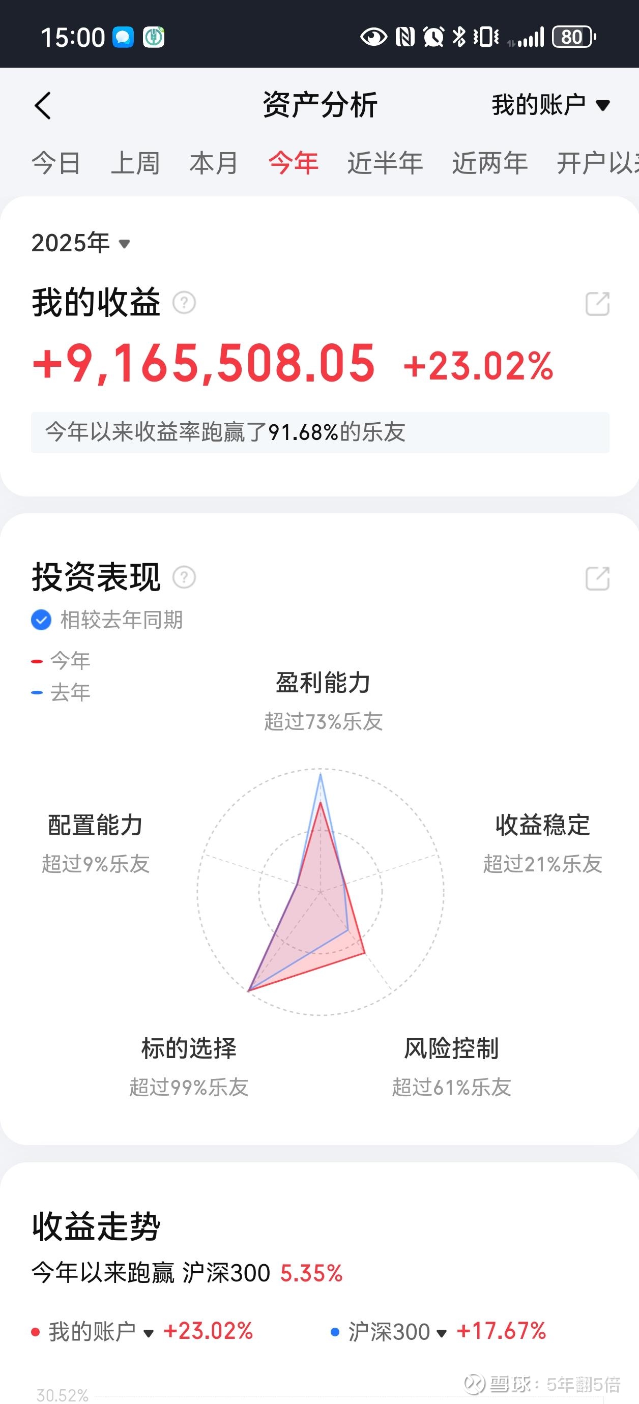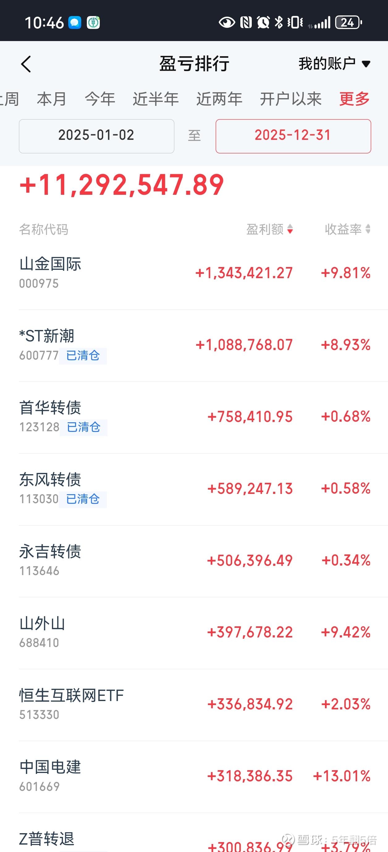 2025年盖棺定论了,全年盈利916万 收益率 23%,跑赢沪深300 5个百分点,很遗憾没有获取到8位数的收益,这个成绩在熊市还可以,在牛市表现算是不及格了 不说那些今年翻几倍的雪球大神,就连收益率80% 60%的也大V也比比皆是,我这算勉强及格吧,只能勉强跟@省心省力 省大打个平手