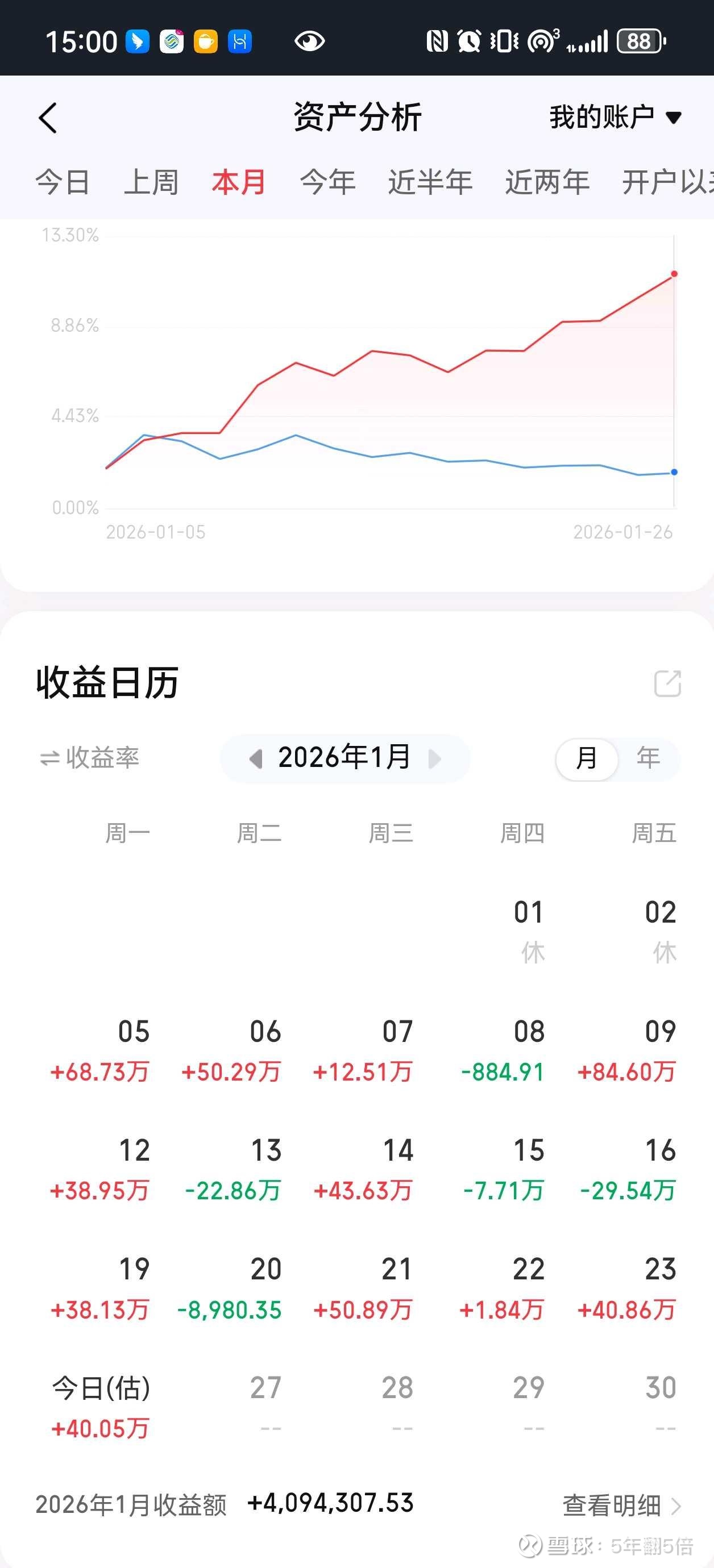 今天大盘高位震荡 沪深300终于没有大单压盘了。不知道是不是GJD休息了 账户赚40W 主力还是靠黄金啊 不过黄金已经出的七七八八了 后面估计赶不上了