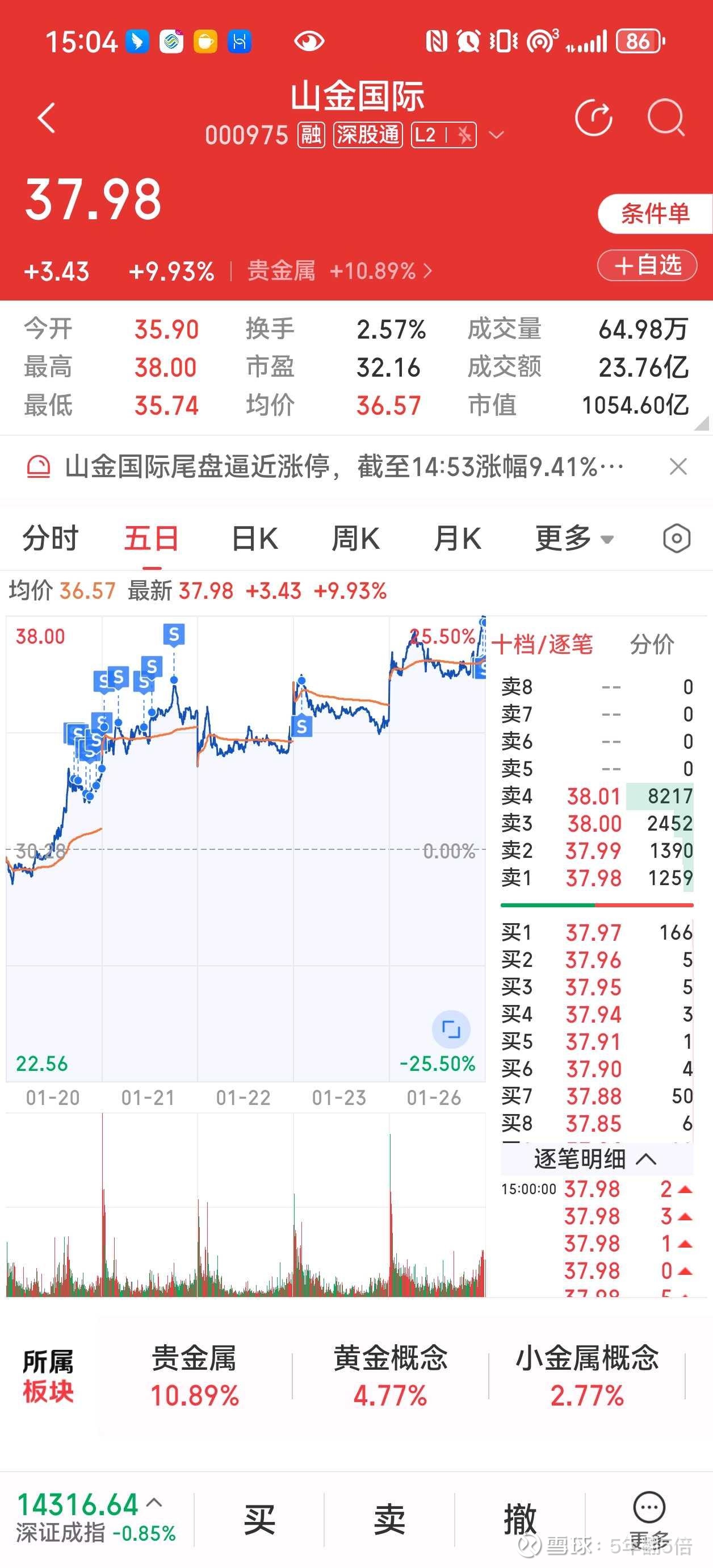 $山金国际(SZ000975)$ 出的有点早了 最近的仓位是25追回来的 目标价30 前几天31 32就开卖 谁想到今天38了