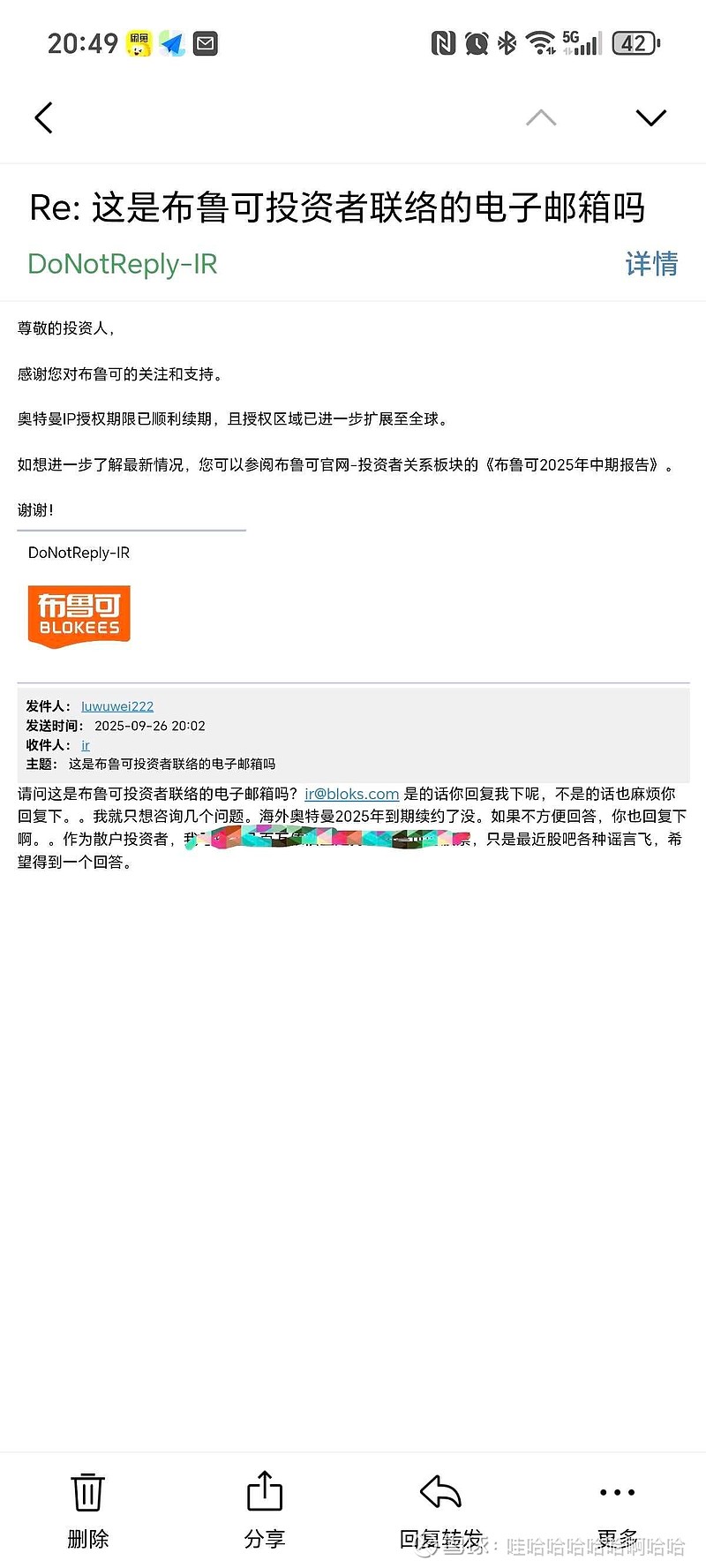 $布鲁可(00325)$布鲁可海外奥特曼IP已经续约成功,并且授权已经扩展到全球。在官方邮件回复中已经确认,2025年到期的布鲁可海外奥特曼IP授权已经确认续约成功,并且奥特曼IP版权授权已经扩展到全球。