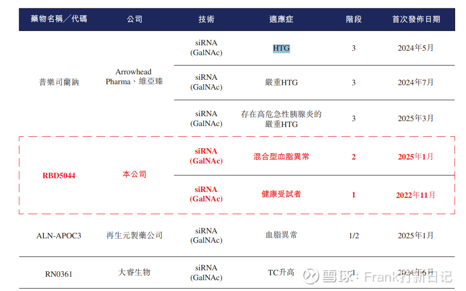 一、瑞博生物:手握重磅合作 瑞博生物是一家专注于小核酸(siRNA)药物的创新药企,其核心产品RBD4059用于治疗血栓性疾病,目前在国内临床II期研发中进度领先。