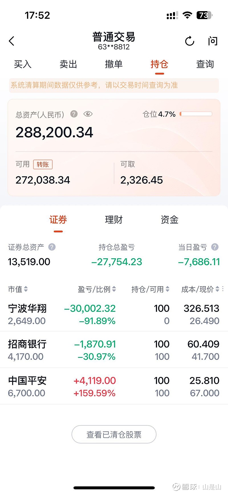 宁波华翔今天割肉,亏损3万,账户来到了28.8,总想着一笔暴富,不现实。今天还可以,跌破支撑位也没留恋,明天又有一个吸血鬼上市,不知道会是什么情况,这段时间机构都在卖出,散户亏损挺多的,行情不好的时候尽量少做,希望自己可以记着这次的教训。