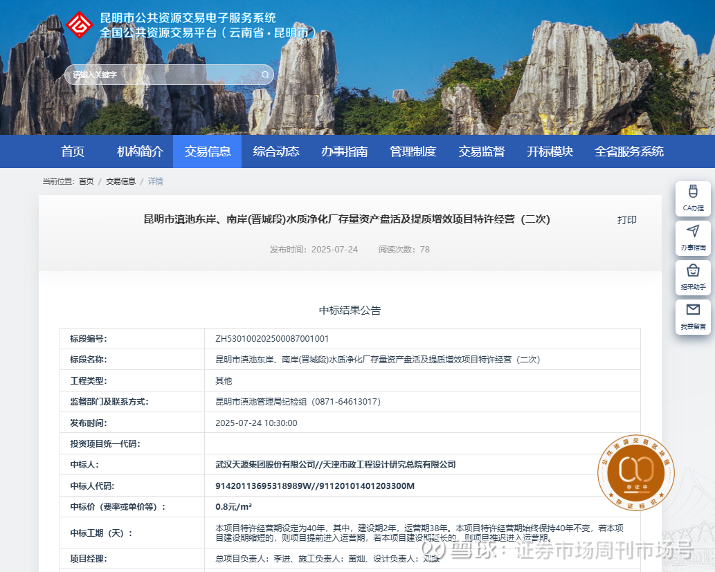 近日,武汉天源集团收到昆明市滇池管理局发来的《中标通知书》,确认公司为昆明市滇池东岸、南岸(晋城段)水质净化厂存量资产盘活及提质增效项目特许经营(二次)项目的中标人,项目总投资约14.99亿元。