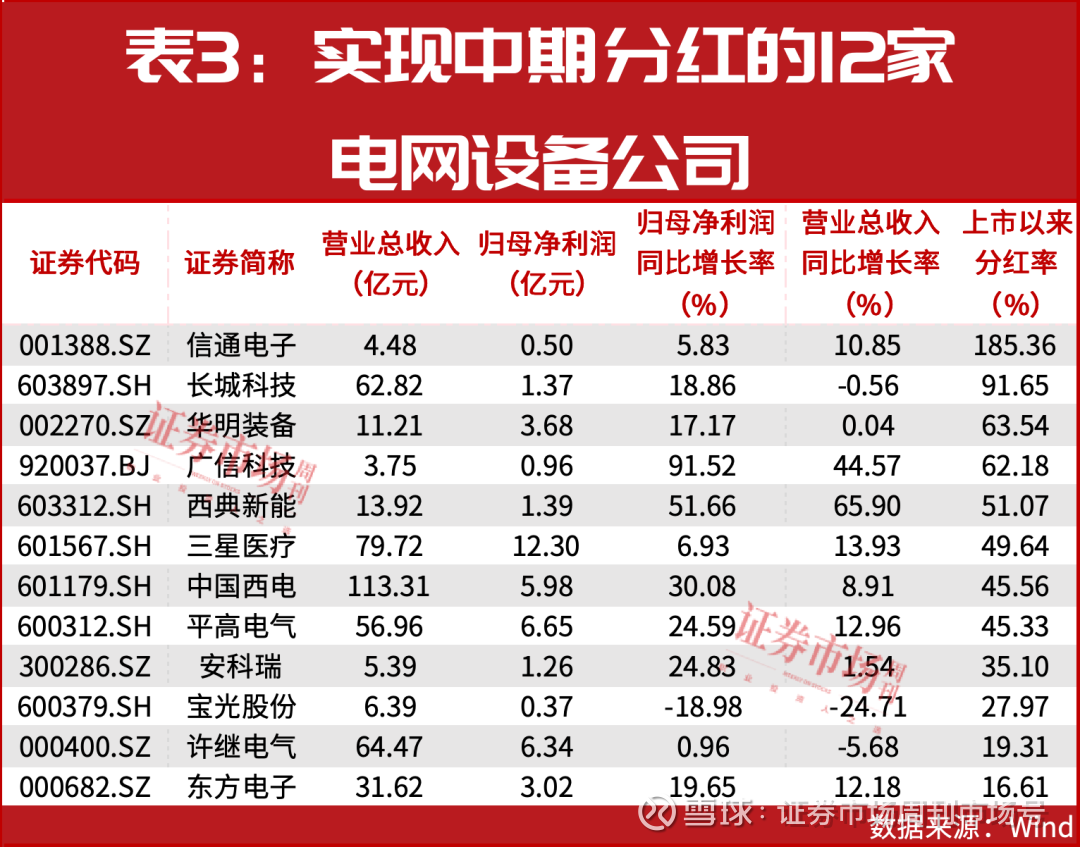 就目前来看,在71家披露2025年半年报的电网设备公司中,有12家公司在半年报中明确了中期分红,分别为信通电子、长城科技、华明装备、中国西电、许继电气、平高电气等(见表3)。在2024年同期宣布进行中期分红的公司家数为7家。