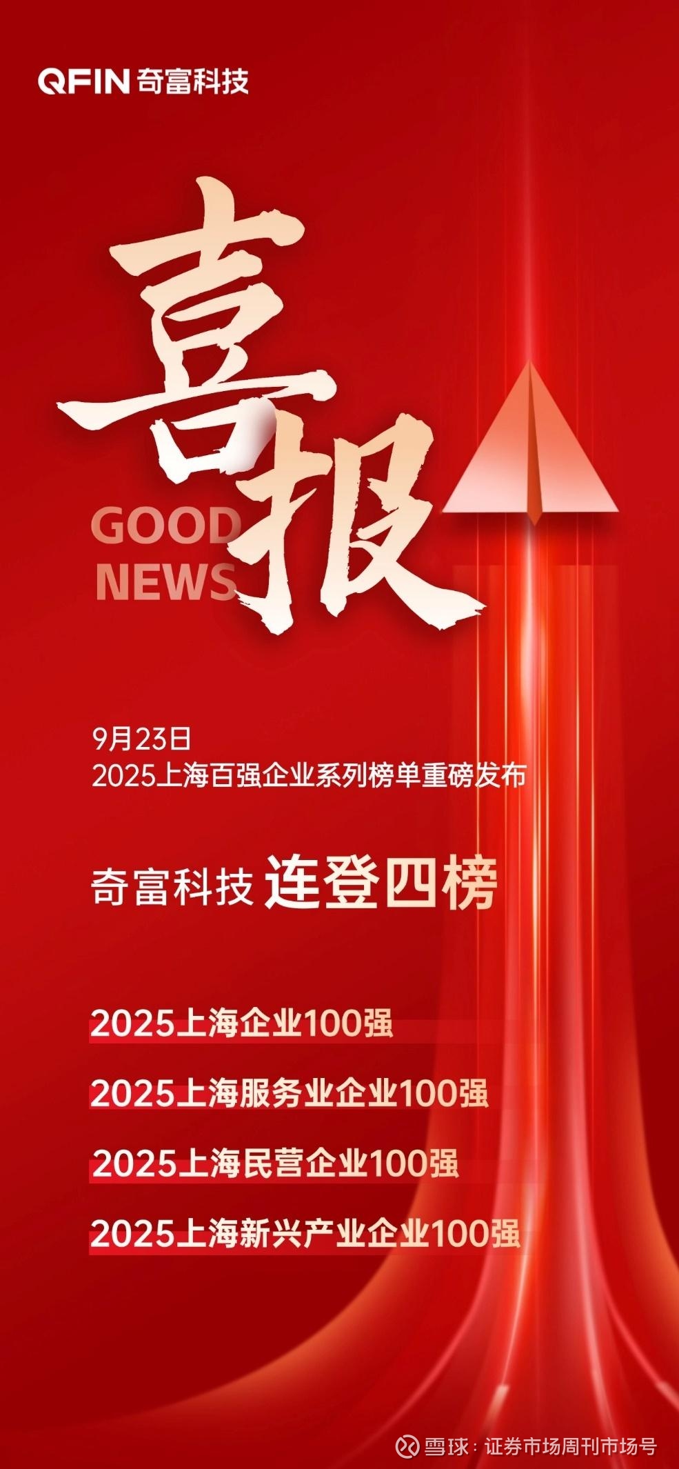 9月23日,上海市企业联合会、上海市企业家协会、上海市经济团体联合会和解放日报社联合召开2025上海百强企业新闻发布会,正式发布2025上海百强企业系列榜单。奇富科技凭借卓越的技术创新能力与稳健的经营实力,荣登2025上海企业100强、2025上海服务业企业100强、2025上海民营企业100强及2025上海新兴产业企业100强四大榜单。