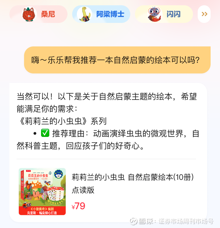 依托荣信文化多年积累的优质内容资源,智趣科技将AI技术与经典内容IP深度融合。本次以公司“乐乐趣”品牌形象“乐乐”为原型,上线的“AI乐乐”智能体能够为孩子们讲解公司旗下众多的科普知识、奇妙故事,并针对孩子们的问题提供解决建议以及智能阅读推荐服务。同时,更是重磅推出“桑尼”、“阿梁博士”、“闪闪”、“侃侃”等5款具备IP属性的AI助读智能体。其中,“闪闪”是针对公司爆款IP“莉莉兰的小虫虫”(系列图书累计销量超300万册)量身打造的智能体,能够精准还原小主人公智多星“闪闪”的角色特质,并通过情感化交互、科普化延伸两大核心功能,打破传统童书的静态阅读边界。
