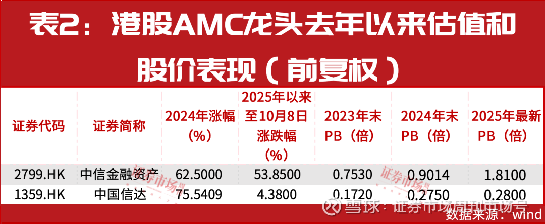 通过瘦身、压实资产质量、优化资产布局,以中信金融资产、中国信达为代表的AMC龙头公司加快回归化解金融风险主业,2024年以来股价和估值均有大幅提升。随着资产负债表的逐步修复,以及被动投资者的持续买入,多家机构的分析师给出看多评级。