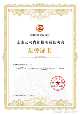 本年度,山西证券凭借在治理与证券事务工作中的良好表现,同时获评中国上市公司协会“2025年上市公司董事会秘书履职评价5A评级”“2025年上市公司可持续发展优秀实践案例”“2025年中国上市公司内部控制优秀实践案例”“2025年上市公司董事会办公室最佳实践”等奖项。