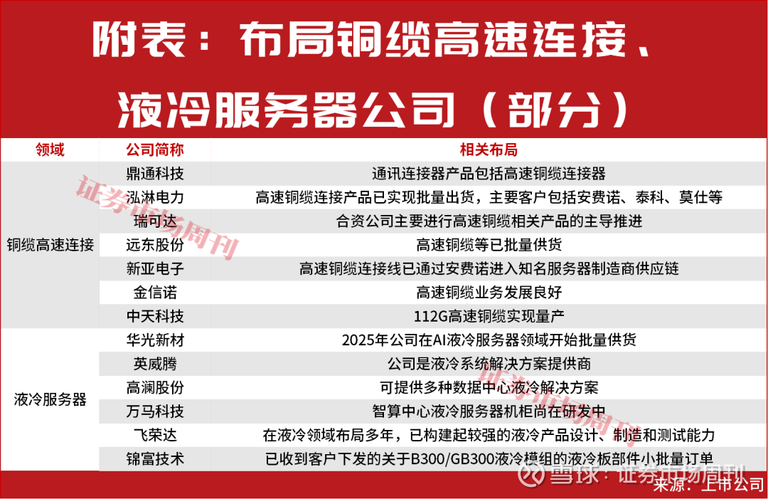 除了鼎通科技、华光新材,泓淋电力、中天科技等公司也“剧透”了在铜缆高速连接或液冷服务器领域的相关业务布局动态(见附表)。其中,不少公司股价同样在近期走出强势行情。