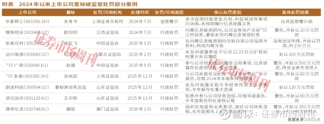 2026年1月,北交所上市公司路桥信息(920748.BJ)因虚增收入与利润被厦门证监局下达《行政处罚书》,时任董事、总经理、董事会秘书魏聪的违法行为情节严重,被罚款同时被采取3年证券市场禁入措施。
