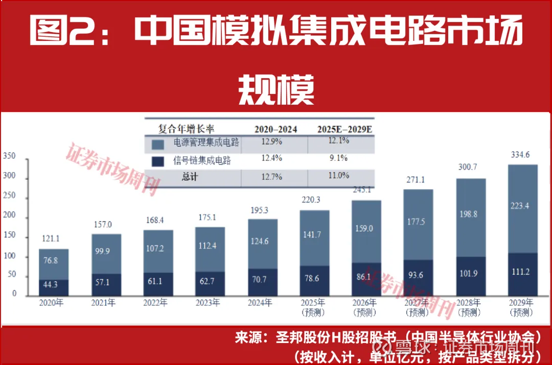另据纳芯微H股招股书,依托新能源汽车的发展和自动驾驶技术的进步,汽车模拟芯片是成长最快、技术门槛最高的领域之一。2024年,智能新能源汽车模拟芯片应用的平均单车价值在1500元-2800元之间,预计到2029年,汽车产业电气化和智能化的深度融合将大幅推动模拟芯片的平均单车价值增长至2200元-4000元。2024年,模拟芯片在汽车应用领域的市场规模达到371亿元,预计到2029年,相应的市场规模将扩大至858亿元。