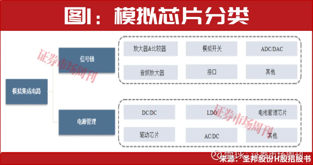 模拟芯片是一种处理连续性模拟信号的芯片。常见的模拟芯片主要包括线性产品、转换器产品、隔离与接口产品、射频与微波产品、各类ASIC芯片、各类电源管理芯片及驱动芯片等。模拟芯片按功能主要分为信号链芯片和电源管理芯片两大类,其中,电源管理芯片主要用于管理电源与电路之间的关系,负责电能转换、分配、检测等功能;信号链模拟芯片则主要用来接收、处理、发送模拟信号,将光、磁场、温度、声音等信息转化为数字信号。