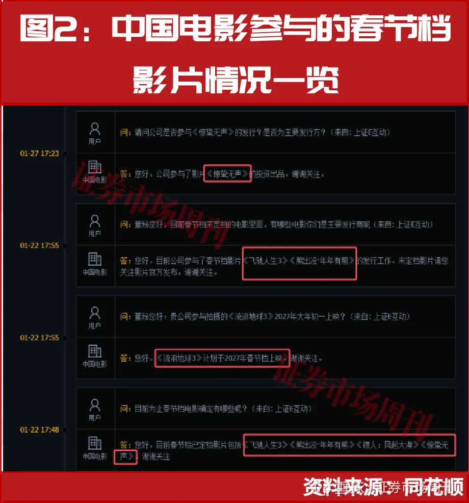 例如,据中国电影在e互动平台上回答提问时透露,公司参与《飞驰人生3》《惊蛰无声》《镖人:风起大漠》《熊出没·年年有熊》四部电影的发行。公司方还提到,其参与拍摄的《流浪地球3》将于2027年上映。