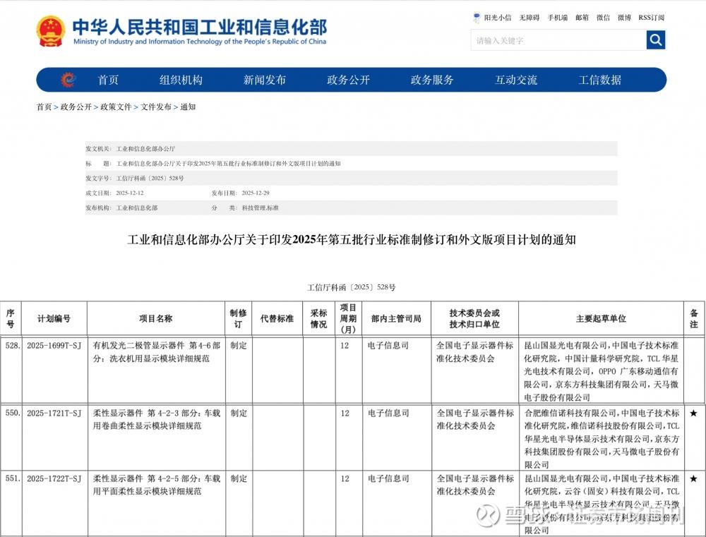 近日,工业和信息化部下发《关于印发2025年第五批行业标准修订和外文版项目计划的通知》,维信诺主导的《柔性显示器件 第4-2-3部分:车载用卷曲柔性显示模块详细规范》《柔性显示器件 第4-2-5部分:车载用平面柔性显示模块详细规范》《有机发光二极管显示器件 第4-6部分:洗衣机用显示模块详细规范》获批立项。此次立项是维信诺对新型显示产业发展趋势的前瞻布局与精准响应,为新型显示产业高质量发展注入强劲动力。