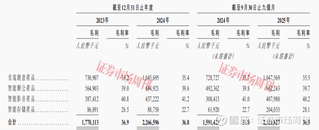 招股书显示,报告期内,绿联科技的整体毛利率分别为36.9%、36.8%和36.5%,整体略有下滑。从具体业务来看,绿联科技第一大业务充电创意产品的毛利率维持在35%以上;智能存储产品的毛利率则波动略大,2023年时为26.5%,2024年时则下降至22.7%,而2025年前三季度则又回升到28.1%;智能办公产品和智能影音产品的毛利率则分别在39%和40%以上,保持了相对稳定的水平。